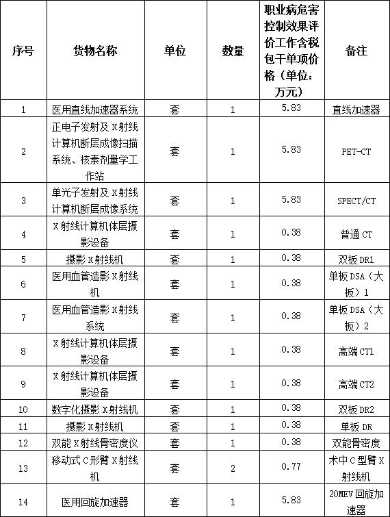 1.1.2服務內容: 綿陽三江醫院項目(一期)職業病危害控制效果評價工作全部工作內容:進行現場驗收檢測并編制職業病危害放射防護控制效果評價工作報告書,協調市衛健部門召開職業病危害控制效果評價工作報告專家審核會議,通過專家評審,并最終取得批復。具體設備如下: