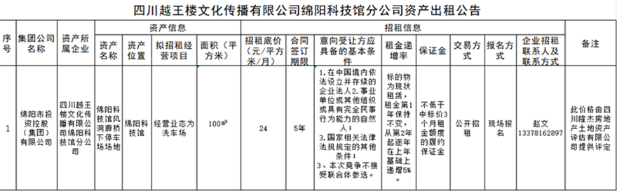 四川越王樓文化傳播有限公司綿陽科技館分公司資產(chǎn)出租