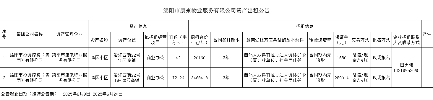 綿陽市康來物業(yè)服務有限公司資產(chǎn)出租公告