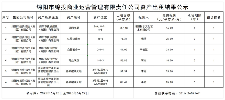 綿陽市綿投商業運營管理有限責任公司資產出租結果公示