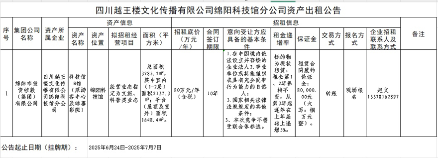四川越王樓文化傳播有限公司綿陽科技館分公司資產出租公告