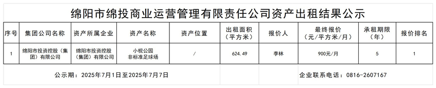 綿陽市綿投商業運營管理有限責任公司資產出租結果公示