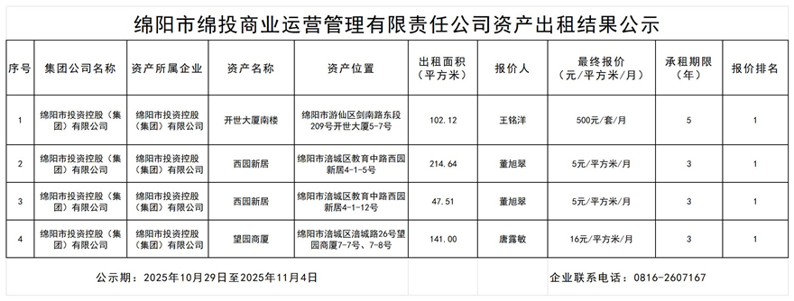 綿陽市綿投商業運營管理有限責任公司資產出租結果公示