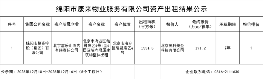 綿陽(yáng)市康來(lái)物業(yè)服務(wù)有限公司資產(chǎn)出租結(jié)果公示