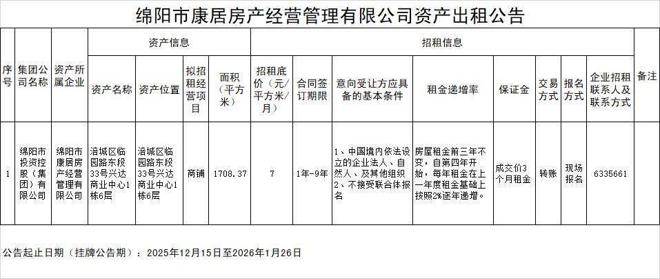 綿陽(yáng)市康居房產(chǎn)經(jīng)營(yíng)管理有限公司資產(chǎn)出租公告
