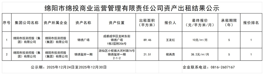 綿陽市綿投商業(yè)運營管理有限責(zé)任公司資產(chǎn)出租結(jié)果公示