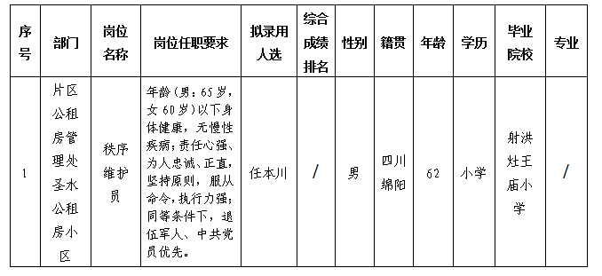 根據康居公司發布的長期招聘一線勤雜人員的招聘公告相關規定,經面試、體檢等程序,擬錄用任本川同志到綿陽市康居房產經營管理有限公司片區公租房管理處圣水公租房小區工作,現予以公示,具體情況如下: