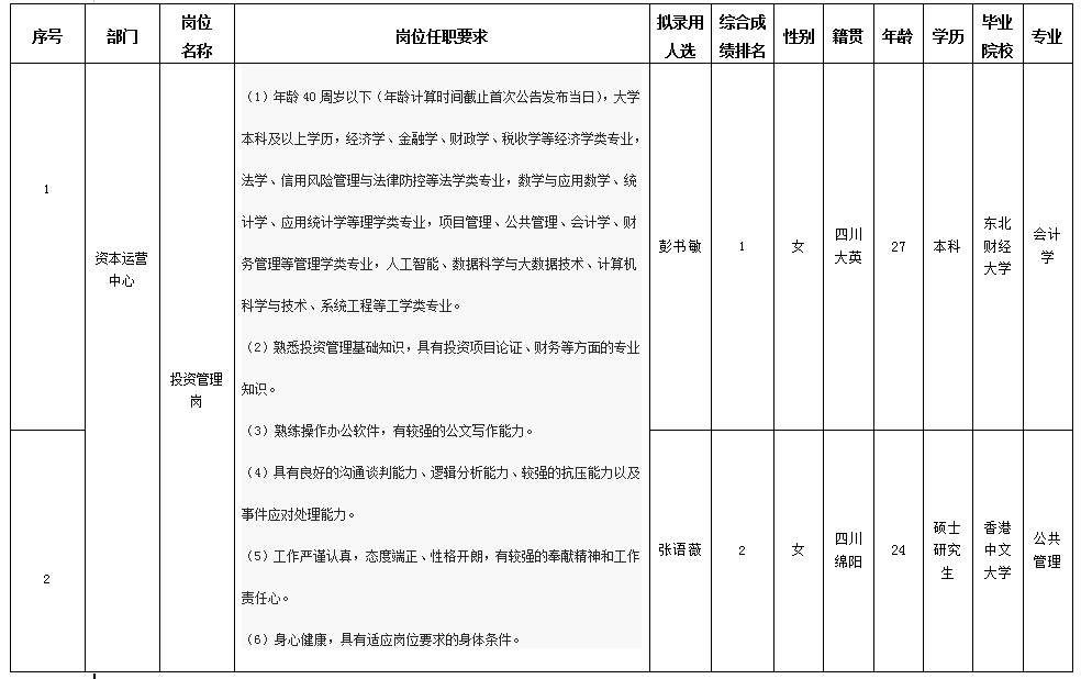 根據綿陽市投資控股(集團)有限公司發布的招聘公告及招聘相關規定,經筆試、面試、考察、體檢等程序,擬錄用彭書敏等同志到綿陽市投資控股(集團)有限公司工作,現予以公示,具體情況如下: