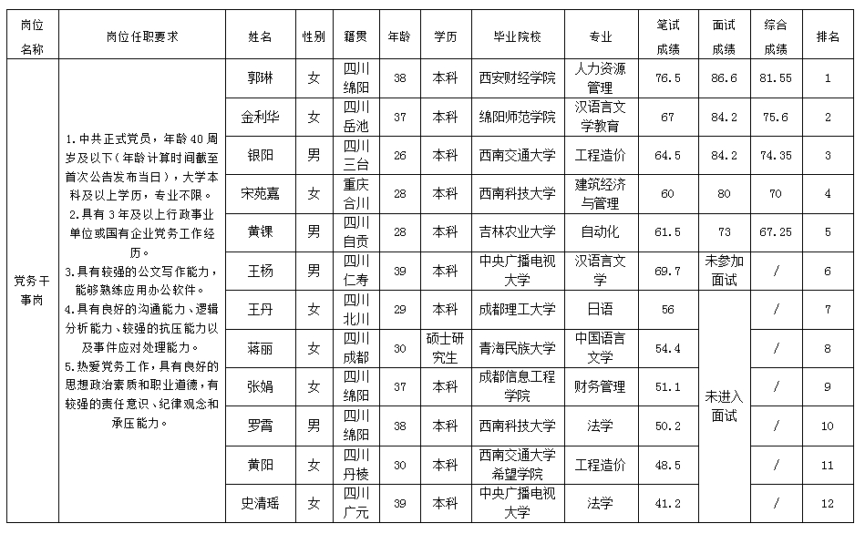 根據綿陽市投資控股(集團)有限公司發布的招聘公告及招聘相關規定,經筆試、面試等程序,現將筆試(面試)成績予以公示。