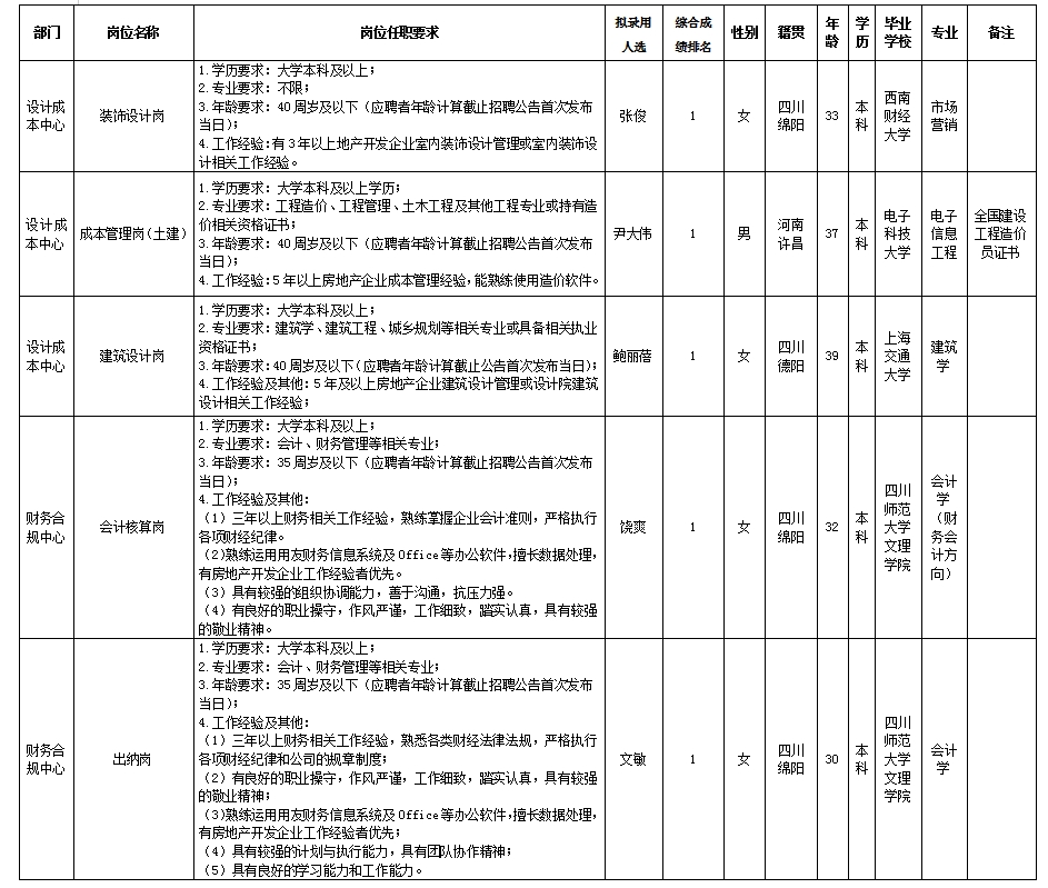 根據綿陽市綿投置地有限公司發布的招聘公告及招聘相關規定,經筆試、面試、考察、體檢等程序,擬錄用張俊等5名同志到綿陽市綿投置地有限公司工作,現予以公示,具體情況如下: