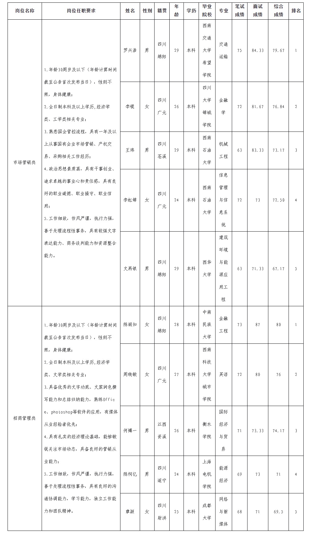根據綿陽市綿投商業(yè)運營管理有限責任公司發(fā)布的招聘公告及招聘相關規(guī)定,經筆試、面試等程序,現將筆試、面試成績予以公示。