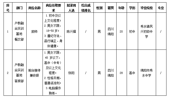 根據(jù)綿陽市綿州嘉來會務服務有限公司發(fā)布的招聘公告及招聘相關規(guī)定,經(jīng)面試、體檢等程序,擬錄用陳興熠、張陽同志到產(chǎn)教融合實訓基地餐飲部、客房部工作,現(xiàn)予以公示,具體情況如下: