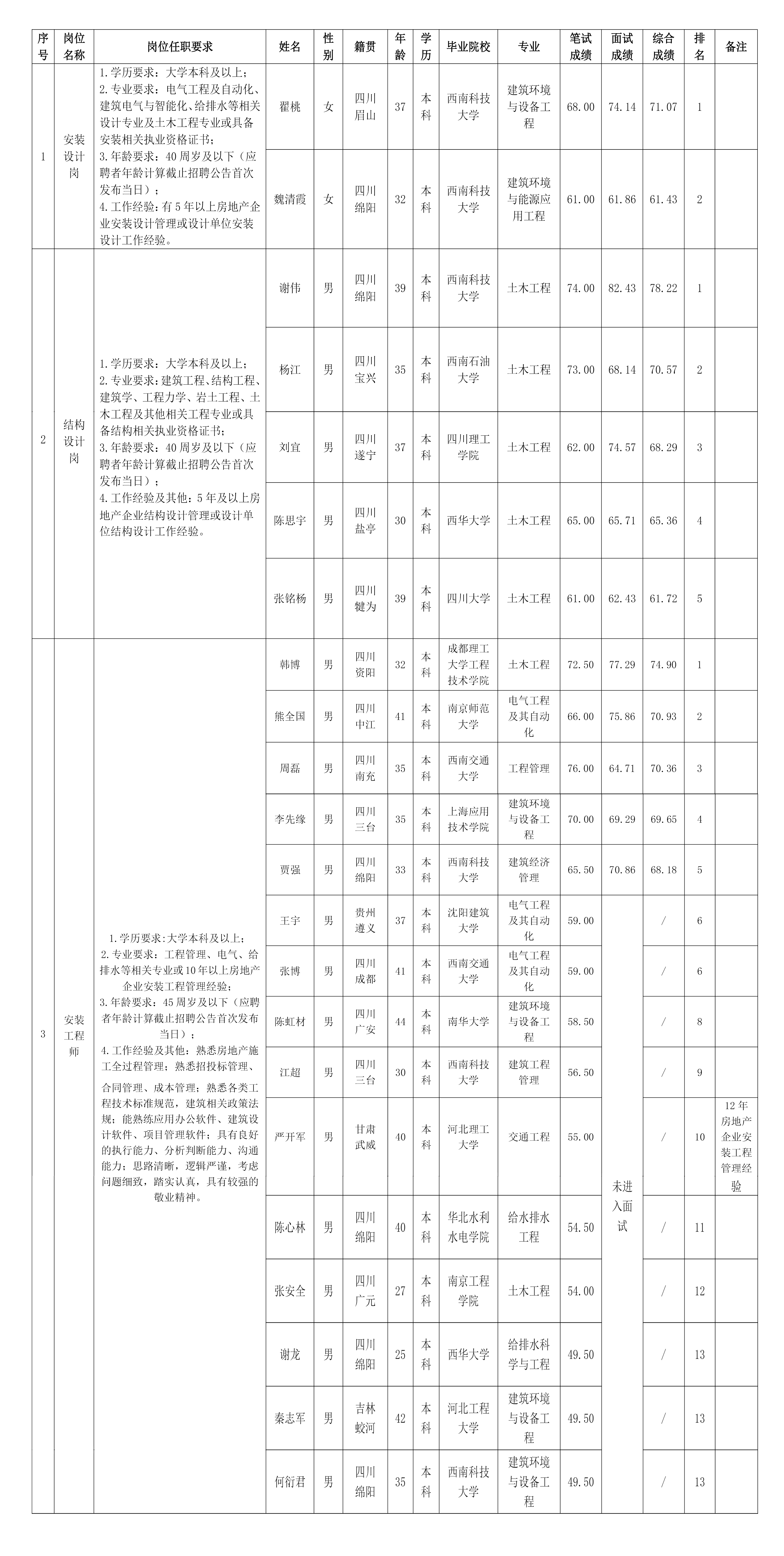 根據綿陽市綿投置地有限公司發布的招聘公告及招聘相關規定,經筆試、面試等程序,現將筆試、面試成績予以公示。
