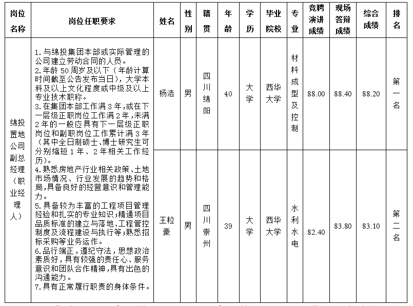 根據綿投集團《關于開展綿投置地公司經理層副職(職業經理人)內部選聘的公告》(綿投控司發〔2025〕119號)及招聘相關規定,經競聘演講、現場答辯等程序,現將競聘成績予以公示。