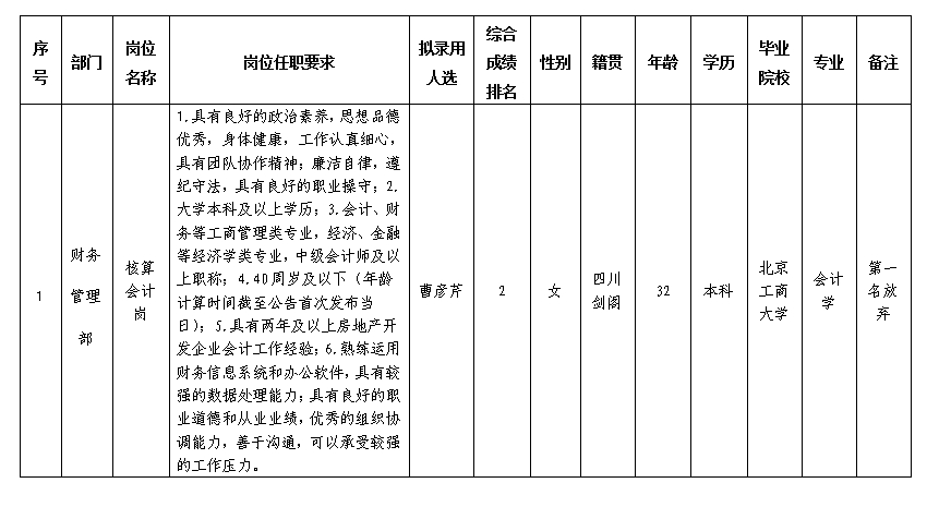 根據(jù)綿陽市嘉遠(yuǎn)瑞華房地產(chǎn)開發(fā)有限公司發(fā)布的招聘公告及招聘相關(guān)規(guī)定,經(jīng)筆試、面試、考察、體檢等程序,擬錄用曹彥芹同志到核算會(huì)計(jì)崗工作,現(xiàn)予以公示,具體情況如下: