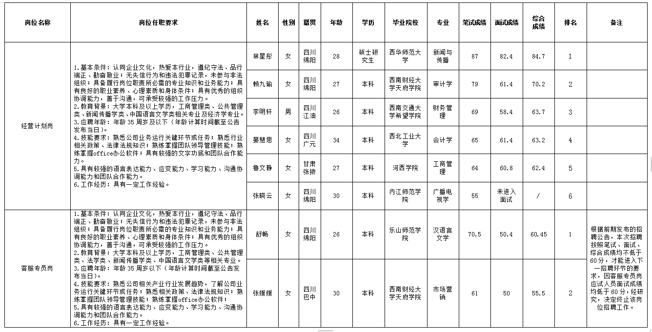 根據(jù)綿陽市城市停車管理有限公司發(fā)布的招聘公告及招聘相關(guān)規(guī)定,經(jīng)筆試、面試等程序,現(xiàn)將筆試(面試)成績予以公示。
