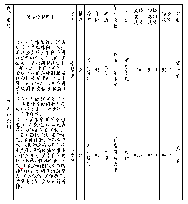 根據(jù)綿陽市綿州嘉來會(huì)務(wù)服務(wù)有限公司發(fā)布的招聘公告及招聘相關(guān)規(guī)定,經(jīng)競聘演講、現(xiàn)場答辯等程序,現(xiàn)將競聘成績予以公示。