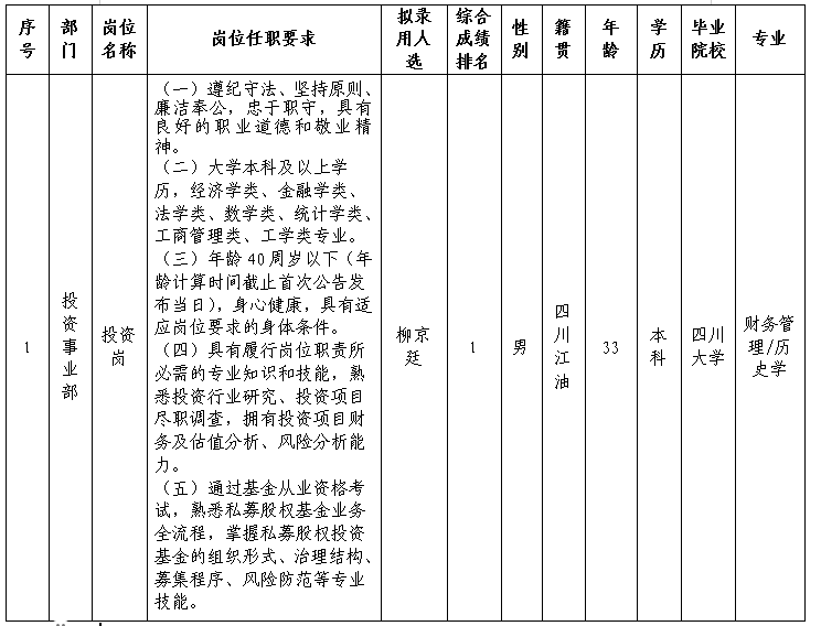 根據綿陽綿投私募基金管理有限公司發布的招聘公告及招聘相關規定,經筆試、面試、背調等程序,擬錄用柳京廷同志到綿陽綿投私募基金管理有限公司工作,現予以公示,具體情況如下: