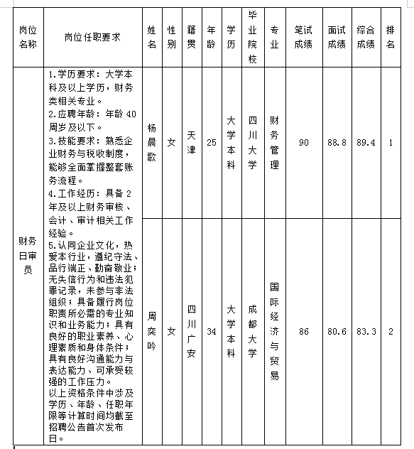 根據綿陽富樂山九洲國際酒店有限公司關于財務日審員招聘公告及招聘相關規(guī)定,經筆試、面試等程序,現將招聘成績予以公示。