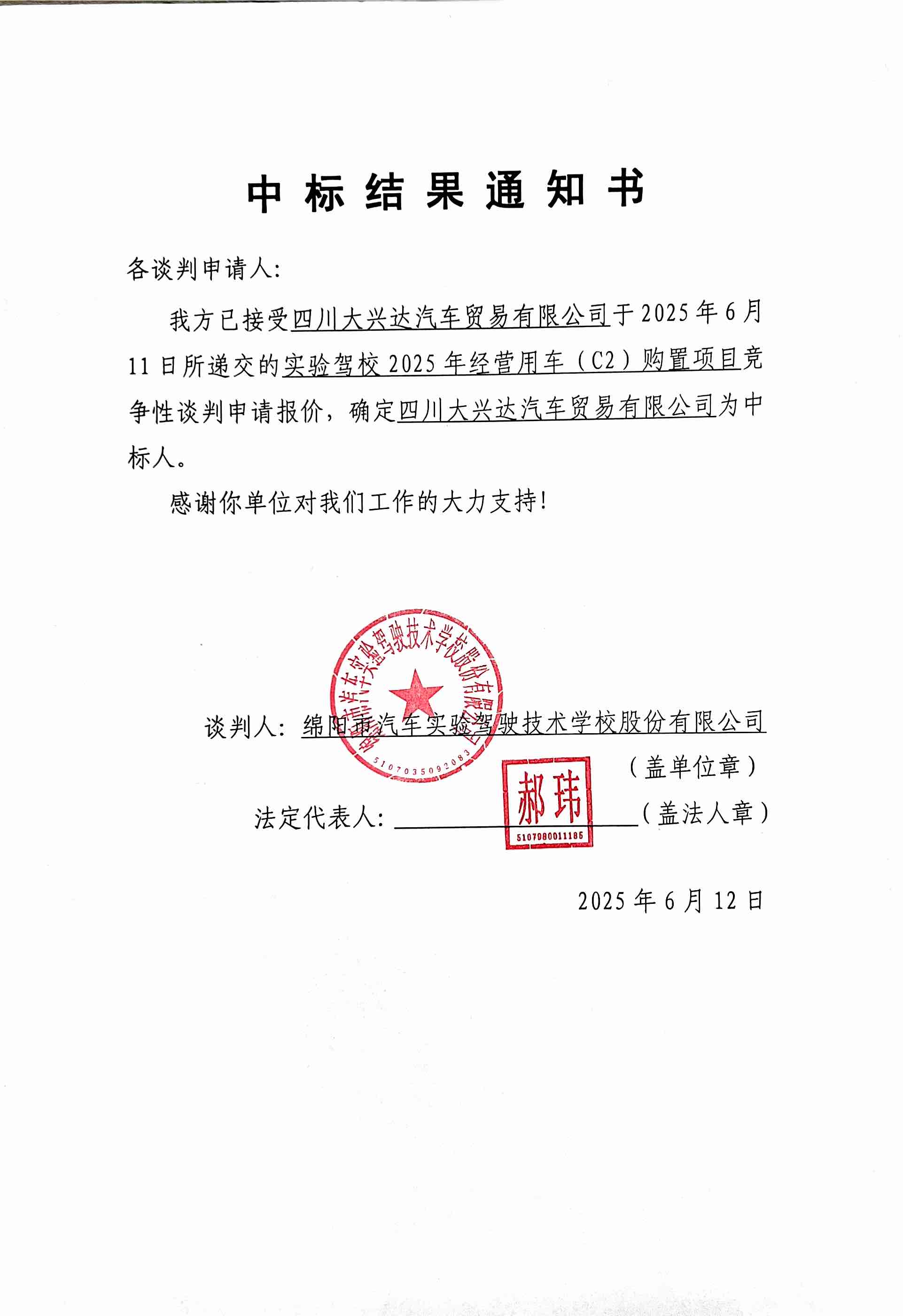 實驗駕校2025年經營用車(C2)購置項目中標結果通知