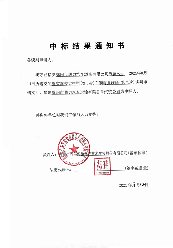 綿實駕校大中型(客、貨)車輛定點維修(第二次)中標結果通知