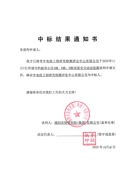新華小區4棟、6棟、8棟房屋安全動態監測中標結果通知