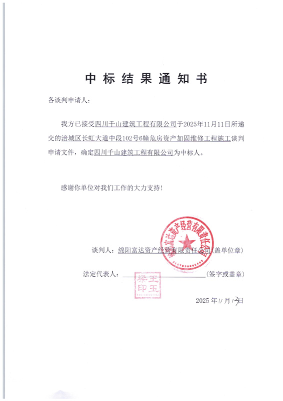涪城區(qū)長(zhǎng)虹大道中段102號(hào)6幢危房資產(chǎn)加固維修工程施工中標(biāo)結(jié)果通知