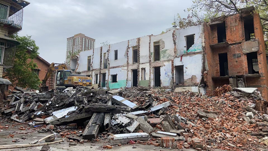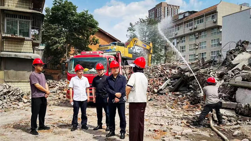 危房緊鄰周邊住宅,施工空間狹小,拆除難度極大。為確保拆除工作安全有序進行,富達公司多次組織建筑、安全專家現場勘查,研究制定了“機械拆除為主,人工配合為輔”的精細化拆除方案。拆除現場,工作人員設置警戒線封鎖拆除區域,專人疏導圍觀群眾,維護現場秩序。伴隨著挖掘機的轟鳴聲,危房樓體結構在專業人員的精準操控下逐步瓦解,同步實施灑水降塵措施,整個拆除過程安全、有序、環保。